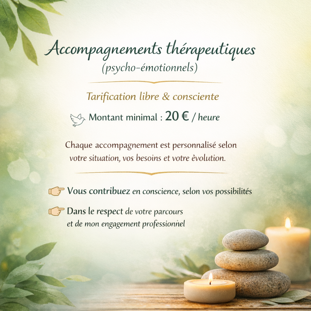 Je ne pratique pas de tarifs fixes pour les accompagnements psychologiques globaux.